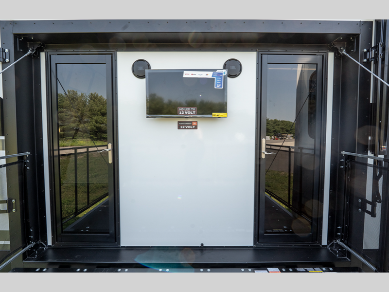 Alliance RV Valor toy hauler 42V14 highlights: Fold-Down Side Patio Fireplace ... more about Valor 42V14